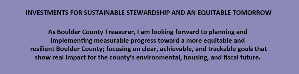 - Assure that Boulder County’s investment portfolio prioritizes green bonds, renewables, and ESG-aligned assets (environmental, social, and governance).